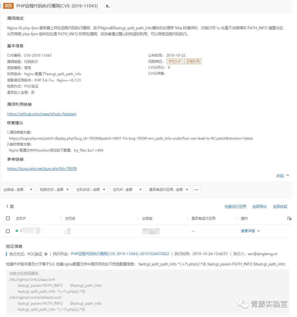 2019年9月26日,PHP官方发布漏洞通告,其中指出:使用 Nginx + php-fpm的服务器,在部分配置下,存在远程代码执行漏洞.且该配置已被广泛使用,危害较大,影响较为广泛。