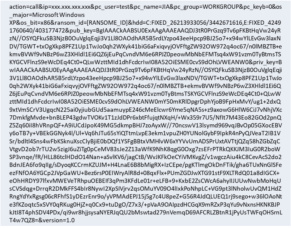 该样本的网络功能较复杂,主要功能有二,一是使用nslookup查询C2服务器的IP地址,二是通过网络回传系统信息及RSA密钥。