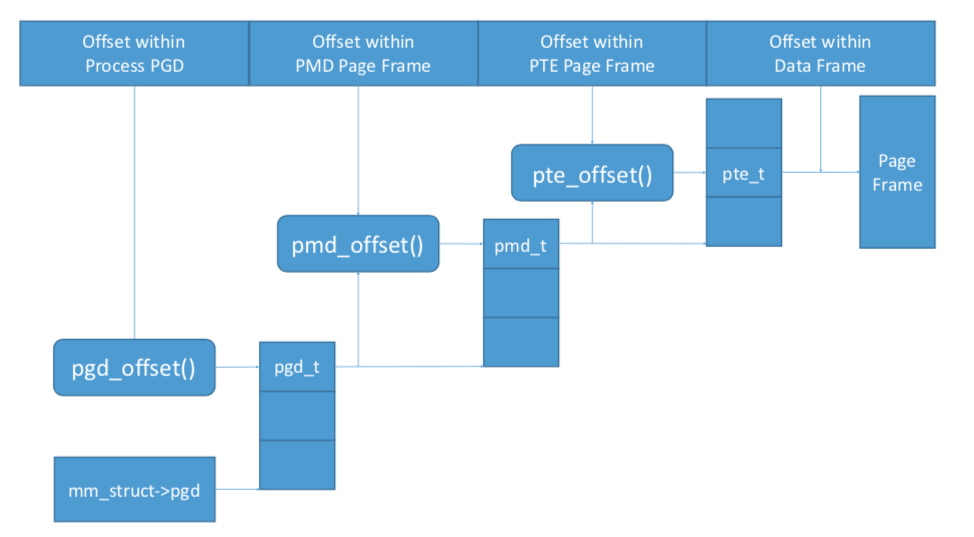 Linux内核经典的三级页表(PGD\PMD\PTE)布局和遍历关系如下图所示。
